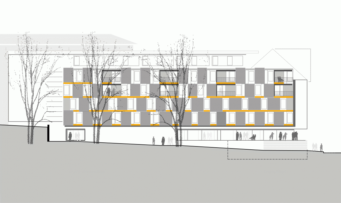 Der Winkelbau leitet zugleich aber auch ein in die Bebauung entlang der Klugestraße. Dort liegt geschützt der Hauptzugang zum Seniorenwohnen. Der höhengestaffelte Baukörper entlang der Klugestraße reagiert auf die steile Hanglage. Das Wohnen in den Obergeschossen deutet die hervorgehobene Stellung des Wohnens an diesem Ort an. Inhaltlich steht das Altenwohnen in enger Verbindung zur Altenpflege.